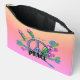 This accessory bag bright pink fading to oranges with a cool 1960s era blue peace sign with colourful scoll designs and shooting pink stars with the word Peace.