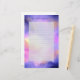 Cosmic stationery with semi-transparent lines layered over top. Dreamy writing paper with a nice combination of soft pastels and bright colors. A colorful abstract painting with a cosmic space image in pink, purple and yellow watercolors. The colors blend and mix together creating luminous ethereal clouds with little twinkling stars peppered throughout. Personalize with your name at the top and your address at the bottom.