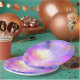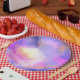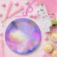 An elegant paper plate with a nice combination of soft pastels and bright colors. A colorful abstract painting with a cosmic space image in pink, purple and yellow watercolors. The colors blend and mix together creating luminous ethereal clouds with little twinkling stars peppered throughout.