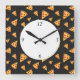 Cool and fun pizza slices pattern on black and white clock face. Juicy vector made pizza with crunchy crust, cheese, salami, champignon mushrooms, olives and a sprinkle of oregano.