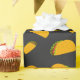 Cool and fun taco pattern on dark grey background. Yummy vector illustration made with toasty tortilla with meat, salad, tomatos and cabbage.