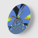 Blue: The dominant color of the background, bright and saturated, establishes a vibrant backdrop that enhances the overall composition.