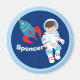 A cool outer space magnet gift for a kid who loves the planets and spaceships. Features an astronaut in a spacesuit of red and blue floating in the sky next to a rocket ship. Customize with your child's name in white on the deep blue background and use this to hang their art on the fridge.