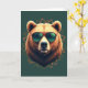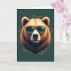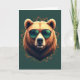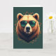 This design shows a stylized bear’s head centered on a deep, muted teal background, giving the scene a cool, city-at-night mood. The fur is shaded in warm golden-brown with darker undertones, with soft gradients around the ears and muzzle that add depth without looking overly realistic. The bear wears aviator-style sunglasses with crimson frames and emerald-tinted lenses, and the hidden eyes create a teasing, friendly mystery that feels like a quiet inside joke ❤️. Around the head, a radiant halo of angular shapes and thin triangular rays spreads outward in warm gold and fiery orange, like a glowing spotlight from a late-night rooftop. The sharp geometry contrasts with the plush fur, creating a mix of tough and tender that reads like confident affection between friends. There’s no headline text, leaving the focus on the face and the halo, while the strongest color accents stay in the red frames and green lenses. Fine highlights catch along the fur edges, and the gold-and-orange rays form a crisp ring around the bear against the teal field 🌼.