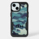 Cool blue army camo custom monogram Otterbox iPhone 15 Case. Cool military style cover with personalized name initials. Durable shockproof protection for smartphones.