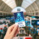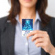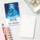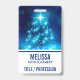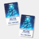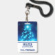 Name badge with a Christmas tree decorated with vibrant electric-blue holiday lights. Sparkling and glittering with festive joy.