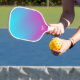 Play in style with this cool pickleball paddle featuring a sporty blue/pink geometric gradient pattern along with your custom text - add your name, pickleball club name, company name, location, phone number, etc. A perfect gift for parents, grandparents, friends, clients, kids, bridal party, beginners and experienced players alike - you're sure to be the talk of the pickleball court.
