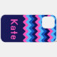 A monogrammed phone case featuring a bright, colorful pattern design of blue and pink chevrons. Create the perfect customized gift by clicking the “personalized” button to add a name or custom message in the provided template field. Select the “click to customize further” link to change the font, text size and more.
