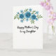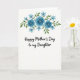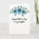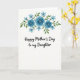 This card features a botanical arrangement on a wide off-white background, with a curved garland of flowers and leaves spreading across the upper area like a gentle embrace ❤️. Three large, stylized rose-like blooms in medium cerulean blue anchor the cluster, each with a darker blue center touched by tiny white strokes that suggest layered petals. Around them, smaller five-petaled flowers in a lighter sky blue float between thin green stems, creating the look of a close-knit gathering. The greens range from fresh to slightly deeper tones, and the leaves overlap in a way that feels like friends leaning in for a photo. Below the flowers, the message “Happy Mother’s Day to my Daughter” sits centered in deep black lettering, standing out clearly against the pale space. Soft, watercolor-like brush textures show in the petals and foliage, giving the design a tender, romantic calm 🌼. The floral garland stays at the top, while the lower half remains mostly open, with the black text resting beneath the bouquet.