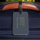 Elegant fully customizable luggage tag design with deep blue background, brown bold monogram.