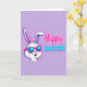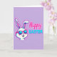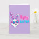 Designed with a muted lavender background, this card features a white cartoon bunny on the left, drawn with dark blue outlines and long upright ears 🐰. The bunny’s open-mouthed smile and softly blushed cheeks give it a sweet, friendly look, like it’s sharing a private joke with someone just off to the right. Hot pink sunglasses sit on its face, and the cyan lenses shine with a glossy, digital-like reflection that adds a modern touch. To the right of the bunny, the word “Happy” appears near the top in bright fuchsia lettering with a gentle glow, balancing the character like a conversation partner. Under it, “EASTER” is set in all caps in electric teal, matching the lens color and strengthening the color pairing. Both lines of text carry a soft halo that stands out against the lavender, while the pink-and-teal contrast hints at a flirty, affectionate energy 🌷. The overall layout is simple and graphic, with the bunny left, the greeting right, and the sunglasses’ cyan shine catching the eye first.