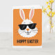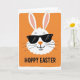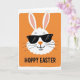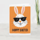 This design shows a modern white bunny head centered on a saturated orange background 🐰. The bunny is drawn with simple, smooth lines, and it wears dark sunglasses that give it a cool, slightly flirty look, like it’s sharing a private joke with someone close. A few curved marks above the glasses hint at smiling eyes, adding a friendly, affectionate expression without showing the full face. Long upright ears frame the top, with soft pink inside that gently warms the otherwise high-contrast palette. Around the edges, the orange backdrop has a lightly brushed texture that makes the scene feel cozy and inviting 🌷. Near the bottom, a short seasonal message sits in thick black lettering, centered and easy to spot against the orange. The bunny’s small round nose is orange too, matching the background, and the ears’ pink interiors stand out beside the white fur and black shades.