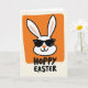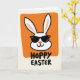 This card features a simple long-eared bunny head 🐰 in bright white with black outlines, centered so it feels like it’s leaning in to greet you. Tall upright ears show soft pink inner details, while a small orange nose and a slight curved mouth give it a friendly, flirty smirk. Dark sunglasses cover the eyes, adding a cool, teasing mystery as if the bunny is sharing a private joke with someone close. The character sits inside a rounded rectangle of warm orange that fills most of the upper portion, set against a creamy off-white background. Below the orange area, a seasonal greeting appears in casual black lettering across two lines, placed near the bottom with plenty of breathing room. The strong contrast between the white bunny, the orange field, and the black outlines makes the design feel confident and modern, with a spring touch 🌷. The orange panel has rounded corners, and the sunglasses include a small light reflection near one lens.