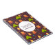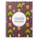 A spiral notebook with a fun camping themed pattern. Set on a reddish brown background. Elements in the pattern include a campfire, a tent,. a guitar, a shovel and backpack.