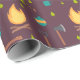 Wrapping paper with a fun camping themed pattern. Set on a reddish brown background. Elements in the pattern include a campfire, a tent,. a guitar, a shovel and backpack.