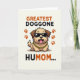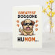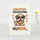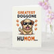 This card shows a tan, cartoon-style dog centered on a soft cream background, standing in a rounded pose that feels friendly and inviting ❤️. Dark shiny sunglasses sit across its face, giving it a cool look that contrasts with the warm, open-mouthed grin and little pink tongue. A thick gold-toned chain hangs at its neck, adding a funny touch that makes the character feel like it’s showing off for someone it adores. On both sides, orange-brown paw prints mirror each other, like a decorative frame around the dog. At the top, large uppercase text in orange-brown reads “GREATEST DOGGONE HUMOM...” and the letters are thick and easy to spot. Near the bottom, matching uppercase text in black continues the message, spaced to balance the design, with a small 🌼 accent nearby. The cream background stays uncluttered so the warm paw prints, the bold lettering, and the dog’s sunglasses and chain stand out with crisp edges.