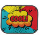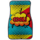 A vibrant comic-style explosion of color bursts onto the scene, featuring the word 'COOL!' in bold, dynamic lettering. The camera performs a rapid zoom-in, emphasizing the energetic vibe of the graphic. Bright yellow, red, and blue backgrounds create a playful contrast, while black comic-style lines radiate outward, enhancing the sense of excitement. The overall atmosphere is lively and fun, capturing the essence of pop art.