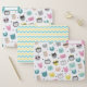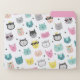 These cute file folders are perfect to keep your cats' records in, or to give as a gift to that friend or relative who is crazy about cats. Two folders have a pattern of cute cool cartoon cat faces in multiple colors, but predominantly teal, yellow, and pink. The images are placed on a white background. The inside of one folder is matching teal, and the other is matching pink. The third folder has a coordinating chevron stripe pattern in the same teal, yellow, and white, with a matching yellow inside.
