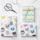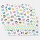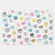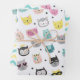 Here's a cute set of gift wrap paper sheets for anyone who loves cats! Two of the sheets have a pattern of cute cool cartoon cat faces in multiple colors, but predominantly teal, yellow, and pink. The images are placed on a white background. The third sheet has a coordinating chevron stripe pattern in the same teal, yellow, and white. A cute gift wrap package that is appropriate for many gift giving occasions, including birthdays and baby showers.