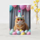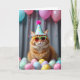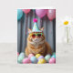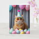 This card features a ginger cat centered like a portrait, looking straight ahead with a calm, slightly amused stare that feels like a knowing glance shared with a close friend. Its orange fur and white whiskers are softly lit, and it wears a light blue party hat covered in tiny multicolored dots with a hot pink pom on top. Neon green sunglasses with warm-tinted lenses sit across its face, giving the cat a cool, human-like attitude. Along the lower portion, a short line of greeting text sits near the bottom edge in a simple light color that stands out against the busy foreground. The foreground is filled with pastel dotted spheres in pink, mint, lavender, and pale blue, creating a confetti-like ground that adds a sweet, affectionate energy 🌷. Behind the cat, out-of-focus balloons in soft pink and muted teal float upward, keeping the scene airy and festive 🐇. The hat’s dotted pattern and the tinted lenses catch the even lighting, while the balloons blur into a gentle backdrop of rounded shapes.