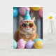 This card features a close-up portrait of a ginger cat in the foreground, its amber fur softly lit to show fine texture and a calm, slightly amused expression. A teal cone party hat with pink polka dots sits on its head, topped with a fluffy rose-colored pom‑pom, adding a light springtime mood 🌷. Pastel-tinted sunglasses cover the cat’s eyes, with frames shifting from soft pink near the nose to lime green at the outer edges, giving the face a friendly, teasing look as if sharing an inside joke. Near the top, small lettering in a pale pastel tone sits against the open background, leaving plenty of space around the cat’s head. Along the lower portion, a short line of text appears in a deeper contrasting color, centered above the blurred foreground shapes. In front of the cat, several smooth pastel eggs with tiny white dots fade into a soft blur, like little gifts set out for a friend 🐇. Behind it all, the background melts into out-of-focus round decorations in gentle spring colors, with the hat’s pink dots and the eggs’ speckles echoing each other across the scene.