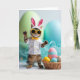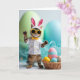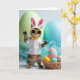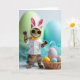This card features an upright tabby cat dressed for Easter, wearing fluffy white ear coverings lined in pink and sunny yellow sunglasses that give it a charming, slightly bashful look 🐰. A white shirt with small yellow dots and a matching yellow bow tie make the outfit feel like it was chosen to impress a dear friend. The cat lifts its paws as if waving hello, with a tiny pink paw pad showing, like a gentle invitation to come closer. Behind it, soft light washes over two large, out-of-focus egg shapes in mint green and sky blue, creating a calm spring setting. Along the bottom, shredded blue “grass” adds texture, like a cozy spot prepared for sharing a quiet moment together 🌷. The Easter greeting is placed near the top in a simple, easy-to-read font, set in a warm yellow that echoes the bow tie and sunglasses. On the right side sits a woven basket filled with eggs in pink with a pale blue stripe, bright yellow, smooth turquoise, and one covered in small pastel dots.