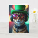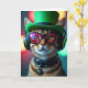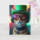 The front design shows a close-up tabby cat facing forward, dressed up like it’s headed to a St. Patrick’s Day night out, with a confident gaze that feels like it’s locking eyes with a favorite person 💚. An emerald-green top hat sits neatly between its ears, contrasting against the soft stripes of its fur. Black-framed glasses rest on its nose, catching magenta and teal reflections that shimmer over chartreuse-toned eyes. Black over-ear headphones hug its head, with a faint lime glow along the edges that echoes the hat. A simple black collar with a small metallic tag circles its neck, adding a sleek finishing touch. The message text is placed near the top in bright green lettering, standing out against the darker tones. Behind the cat, the background fades into a blurred bokeh of warm reds and cool greens that blend together like distant lights ☘️, with crisp whiskers and subtle hat texture staying sharply in focus.