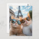 Two stylish cats pose in front of the Eiffel Tower, rocking sunglasses and capturing the ultimate travel selfie on a sunny day in Paris.
