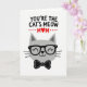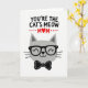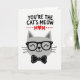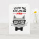 This card features a simple digital illustration of an anthropomorphic cat face centered on a white background, giving it lots of open space to breathe. The cat is drawn in solid cool gray with a friendly asymmetry: one eye winks while the other forms a small curved line, like it’s sharing a private joke with someone it adores ❤️. Oversized rectangular black glasses sit across the face, adding a cozy, clever look, and a neatly tied black bow tie below includes tiny white dashed details for extra charm. Above the character, the message appears in a casual hand-drawn sans-serif style, placed near the top and easy to read. Most of the text is black, while the word “MOM” stands out in deep red, turning the line into a little love note aimed straight at her. Small red dots and a red heart icon sit near the highlighted word, adding a gentle pop of color like a bouquet accent 🌼. The cat’s gray face is framed by the dark glasses and bow tie, with the red heart and dots providing the strongest contrast on the bright white field.