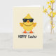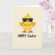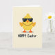 This design shows a round, bright yellow chick centered on a creamy off-white background, drawn with smooth cartoon lines that make it look friendly and a little flirty. Dark sunglasses cover its eyes, giving it a cool, teasing look as if it’s sharing a private joke with someone close by. A shiny gold-toned chain rests around its neck, adding a modern touch that pairs nicely with its sweet, springtime shape 🌷. Its small orange beak and matching webbed feet warm up the palette and keep the figure feeling grounded and approachable. Beneath the chick, a short holiday greeting is set in thick, all-caps lettering, printed in deep charcoal and aligned neatly under the character. The open space around the figure keeps attention on the chick, like it’s standing alone in a spotlight while still feeling inviting 🐰. A soft gray shadow sits just under its feet, lightly anchoring it to the page.