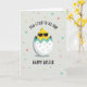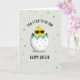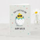 This card features a bright yellow baby bird peeking out of a cracked white eggshell, giving off a friendly, “can’t-wait-to-see-you” energy 🐣🌷. The shell has a jagged opening outlined in teal and dotted with tiny dark specks, adding texture without crowding the design. The little bird has spiky head feathers and wears dark sunglasses, which adds a funny, confident twist that feels like a wink between friends. Soft pastel circles in pink, blue, and creamy tones float around like gentle confetti across a muted gray background, keeping the scene light and festive 🐰. Near the top, the phrase “EGG-CITED TO SEE YOU!” curves in an arch above the bird in matching teal. At the bottom, “HAPPY EASTER” sits centered in a darker tone, anchoring the layout beneath the eggshell. Subtle shading under the shell and around the bird gives a slight lift from the background, while the teal outline and pastel dots remain evenly spaced around the central figure. The sunglasses are a deep charcoal color, and the broken shell pieces angle outward with a crisp white fill and teal edging.