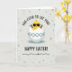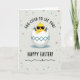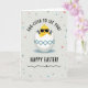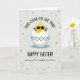 Designed with a sunny yellow baby bird as the main character, the artwork shows it peeking out of a white eggshell while wearing sleek black sunglasses, giving it a friendly, confident look. The eggshell is decorated with a teal geometric pattern, and a soft shadow beneath it adds a little depth. Behind the character, a light grey background is sprinkled with tiny confetti dots in bright blue, muted red, delicate pink, and serene teal, like a spring celebration 🌷. Curved across the top in teal lettering is the phrase “EGG-CITED TO SEE YOU!”, arcing above the chick as if it’s calling out to someone special 🐰. Near the bottom, “HAPPY EASTER!” sits in bold teal text, anchored by a small decorative squiggle underneath. The overall scene feels like a cheerful greeting between friends, with the chick’s tilted pose suggesting it’s showing up just for you. Blue confetti specks drift around the center while the patterned shell frames the chick against the pale grey backdrop.