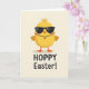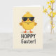 Designed with a plump, round yellow bird centered in the upper portion, this card keeps the background a soft off-white so the character stands out. Dark rectangular sunglasses cover its eyes, giving it a cool, slightly mysterious look that feels like it’s sharing a private joke with the viewer 🐇. A thin golden chain with a round medallion rests on its chest, adding a small touch of charm that reads like a friendly gift between close companions. The beak and webbed feet are a warm orange, creating a gentle contrast against the sunny yellow body. Below the character, a short seasonal greeting is set in rounded sans-serif letters, placed near the bottom center. The text appears in a dark tone that’s easy to read against the pale background, with spacing that keeps the layout airy 🌷. The medallion sits just above the midpoint of the bird’s body, and the orange feet point slightly outward at the lower edge of the illustration.