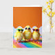 Designed with three tiny, fluffy yellow birds lined up shoulder to shoulder, the scene feels like a close-knit group of friends posing for a fun snapshot 🌷. Each bird wears small sunglasses in a different color—one green, one white, and one red—adding a flirty, confident look to their little faces. Their soft, downy feathers are highlighted by gentle lighting, making them look extra huggable without losing the neat detail of their shapes. Beneath them is a striped surface with multiple bright bands, like a rainbow walkway where they stand with small glossy feet. The background is split into a large orange area above and a pale blue area below, divided by a wavy white border that gives the setting a light, springtime feel 🐇. There’s no wording on the design, so the focus stays on their matching pose and the contrast between the warm orange and cool blue behind them. The trio is centered and evenly spaced, with the sunglasses’ green, white, and red frames popping against the yellow fluff and the multicolor stripes below. A soft white ripple separates the orange top from the light blue section above the rainbow-striped base.