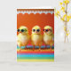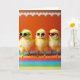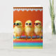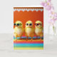 This card features three fluffy yellow baby birds lined up front and center, each wearing tiny sunglasses as if they’re sharing an inside joke between close friends. The left bird wears green-framed shades, the middle bird has white frames, and the right bird sports red frames, with dark lenses that make their small faces look a little bashful and a little proud. Bright, even lighting shows every soft feather, while the birds stand on a rainbow platform made of wide horizontal stripes in many colors. Behind them is a rich orange wall that warms the whole scene and makes the yellow feathers glow. A wavy white scalloped trim runs along the top edge like party decoration, adding a gentle, celebratory touch 🌷. The main greeting text sits near the top in white, with a smaller line of text placed near the bottom in a matching light color, leaving the trio clearly visible 🐇. The orange background is capped by a white scalloped border above the three birds on the striped rainbow base.