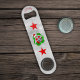 This bottle opener is white with a pattern of various circles and a cool skeleton holding ornaments up to his eyes in a Santa Hat inside a wavy bright green and red circle with a red star above and below him. Customise your name or text with the template.