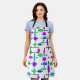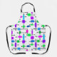 This apron has a mid-century modern design of a grid made of horizontal and vertical black lines with rectangles in various vibrant shades of green, blue, and purple.