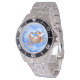 Has heft and feel of expensive stainless steel quartz watches. Good band with safety catch. I removed links, which is easy because engraved arrows show direction to push the linking pins. As always by this seller, the image (a railroad logo) is a perfect reproduction of my emailed image, and is precisely spaced and aligned.