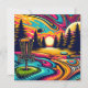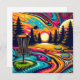 Retro disc golf course with a psychedelic sunset, full moon, swirling colorful water.