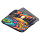 Retro disc golf course with a psychedelic sunset, full moon, swirling colorful water.