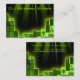 A cool dj businesscard template with a stunning design of a big pile green flurocent glowing speakers and green laser lights in the night sky combined with black backlight music notes on a dark background.
