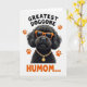 This card features a fluffy, front-facing dog portrait with deep, dark fur set against a plain white background, giving it a cool, confident look. The dog wears orange-framed sunglasses that hide its eyes and a shiny gold chain with a round medallion, adding a humorous touch that feels like a wink to someone special ❤️. Above the dog’s head, black uppercase text curves in an arch reading “GREATEST DOGGONE.” Below the portrait, warm orange uppercase lettering reads “HUMOM…” as if the pet is speaking with affectionate attitude. A few small orange paw prints are scattered around the dog, creating a light, friendly rhythm across the open space 🌼. The limited palette of black, white, orange, and gold keeps everything focused on the dog’s stylish accessories and the message. Several orange paw prints float near the sides of the portrait, echoing the sunglasses color and balancing the curved text above.