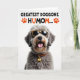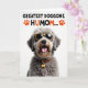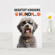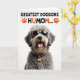 This greeting card features a shaggy-haired dog centered on a bright white background, its soft grey and light brown fur giving it a cozy, affectionate look ❤️. The dog wears spotted animal-print sunglasses with yellow-and-black frames and dark lenses, adding a flirty, “we’re in on the joke together” kind of charm. Its mouth is open in a happy pant, with a small peek of pink tongue that feels like a friendly grin aimed at someone it adores. Around its neck is an orange-and-black spotted collar with a shiny gold, bone-shaped charm that catches the light like a little gift. Near the top, a large line of text in black with orange accents reads “GREATEST DOGGONE HUMOM...,” with small orange paw-print icons on either side 🌼. The lighting is bright and even, making each strand of fur and every graphic detail stand out sharply against the plain backdrop. The sunglasses have a spotted pattern, and the collar repeats the same orange-and-black spots beneath the dog’s smiling face.