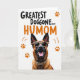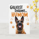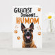 This card features a high-contrast digital illustration of a large dog’s face filling the lower portion, with tawny brown and deep black fur and a friendly, open mouth showing a touch of pink tongue. The dog wears patterned sunglasses that add a flirty, confident charm, like it’s sharing a private joke with its favorite person ❤️. A matching patterned collar sits at its neck, tying the look together with a coordinated, dressy feel. Across the upper area, the text “GREATEST DOGGONE...” appears in thick black letters, followed by “HUMOM” in larger orange letters centered beneath it. The bright white background keeps everything sharp and easy to read, while the dog’s cheerful expression suggests warm companionship without needing extra words. Small orange paw prints and curved swoosh marks are scattered around the text, adding motion and a light, affectionate energy 🌼. Orange paw print motifs and swoosh lines sit against the white space around the headline above the dog’s sunglasses.