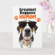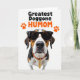 This card features a close-up portrait of a tri-colored dog, centered against a pure white background, wearing dark sunglasses that give it a cool, affectionate “best friend” attitude ❤️. Rich brown, black, and white fur is sharply lit, with fine whiskers and a glossy dark nose drawing attention to the snout. An orange collar circles its neck, paired with a small gold-toned chain that adds a touch of dressy charm without feeling fussy. Above the dog’s head, the main text reads “Greatest Doggone HUMOM,” with “Greatest Doggone” in black and “HUMOM” in bright orange for contrast. Two orange paw prints sit near the wording like little cheers, adding a friendly, caring tone 🌼. The sunglasses tilt slightly over the dog’s eyes, suggesting a teasing, loyal bond between pet and person. The background stays uncluttered so the fur texture, collar color, and shiny lenses stand out. The lettering sits at the top center, framed by the orange paw prints on the white space.