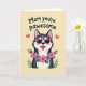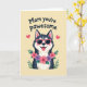 This card features a stylized dog with dark-and-light fur markings, posed front and center with a wide grin and tongue slightly out, giving it a friendly, affectionate look ❤️. Pointed ears frame the face, with soft pink accents inside that add a gentle, caring touch. Bright pink sunglasses sit over its eyes, lending a fun, confident charm as if it’s sharing a flirty little joke with you. Around its neck is a thick floral garland packed with rich pink and soft purple blossoms, tucked among fresh green leaves for contrast. The background is a pale yellow field that keeps everything sunny and light, like a warm day spent together 🌼. Near the top, an affectionate line of text is placed above the character in bold, easy-to-read lettering, set in a dark shade that stands out clearly. Two small pink hearts float near the upper area on either side of the text, balancing the layout. The flower garland shows layered petals in pinks and purples with scattered green leaves against the pale yellow backdrop.