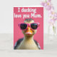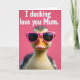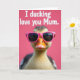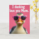 This design shows a fluffy young water bird centered in a close-up portrait against a rich fuchsia background, with a sweet, friendly mood in its curious forward-facing gaze. Its soft golden-yellow down looks extra cozy, and the small orange beak peeks out as if it’s about to nuzzle someone close ❤️. Oversized bright pink sunglasses with dark lenses sit across its face, adding a cheeky, affectionate “look at you” kind of confidence. Near the top, a line of white text is placed above the bird, reading “I ducking love you Mum,” standing out sharply against the pink. The simple backdrop keeps all attention on the bird and the message, like a little private joke shared between family members. Fine feather details around the head contrast with the smooth glossy frames, giving the image a tactile, cuddle-worthy feel 🌼. The background stays uniformly fuchsia with no other objects or scenery, making the pink glasses and white lettering the strongest accents.