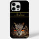 A very cool picture of a fierce looking owl decorates this phone case. Personalize with you/recipient name. Black, gold, and orange color palette. Nice!