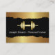 Fitness trainer business cards with some cool factor in a design template you can customize online in a simple but effective layout that includes a gold printed fitness dumbbell, gold printed design elements, and text you can replace with yours. Designed as a business card template for themes related to health, fitness, physical therapy or personal training. Presented on business card stock that has taller than standard size for more visual impact.