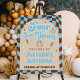 Featuring a playful wavy checkerboard pattern background in light blue, mocha brown, and cream tones, this 4th birthday party decor welcome sign welcomes your guests with a modern, yet retro 4th birthday bash. The smiley face birthday theme includes a happy face with lightning eyes, adding bold personality to your cool dude birthday decor.